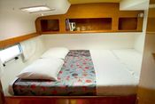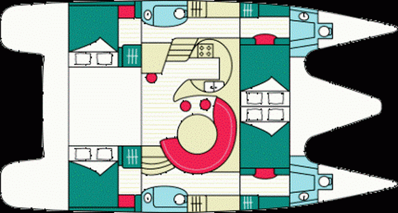 Der kat, ist ein Privelege 435, 13.4 m lang und 7.1m breit. Baubeginn 2004 und Kommisionierung 2005. - Die Ruempfe sind mit 4 Doppelkabinen mit eigener Dusche und Toilette und viel Stauraum ausgestattet. - Im Zentralbereim zwischen den Ruempfen befindet sich ein geraeumiger Salon mit Platz fuer 8 Personen. Dazu kommt links noch eine sehr gut ausgestattete Kueche. Links, in Fahrtrcihtung hinter der Kueche befindet sich der Navigationsbereich mit allen noetigen Instrumenten und der zentralen Schalt- Ueberwachungskonsole der gesamten Bordelektrik. - Der kat ist hochseetauglich und fuer alle Ozeane zugelassen (Zertifizierungsklasse A).