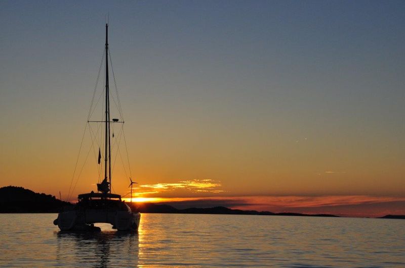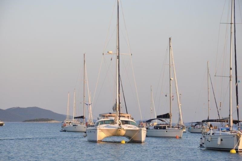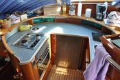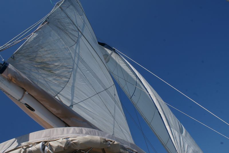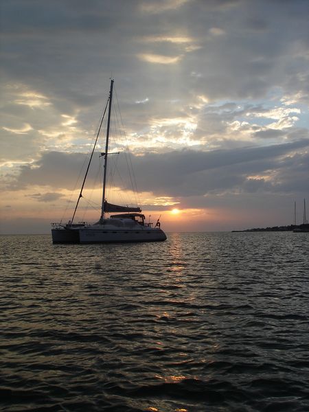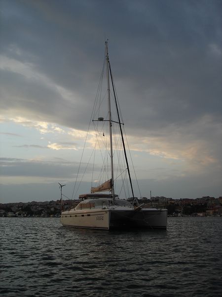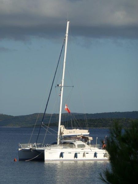 Text must be re-written --------------------------------------- Wie alle Katamarane hat auch dieser 2 Netze zwischen den Bugs. In ihnen kann man ent-spannen oder sich auch anregen. Je nach Lust und Laune. Auf dem Bug gibt es ausserdem links und rechts jeweils eine weisse, weichgepolstere Liege-flaeche; eine Sonderanfertigung. Die Genua oder auch das Grossegel spenden je nach Sonnenstand Schatten auf einer Liegeflaeche und Sonne auf der andern; manchmal auch Sonne auf beiden Liegeflaechen. Hinten im Cockpit gibt es, ausser reichlich Sitzflaeche fuer mehr als 10 Personen, noch auf jeder Seite aussen jeweils eine zusaetzliche Liegeflaeche, etwas schmaeler als die auf dem Bug, aber immer noch gemuetlich zu zweit zu benutzen. Je nach Sonnenstand hat man hier den Schatten des Grosssegels oder des Cockpitdachs. Somit gibt es jede Menge Liegeflaechen die benutzt werden koennen. Badeleiter und Dusche mit Warmwasser stehen auf den achterlichen Teakholzdecks der beiden Ruempfen zur Verfuegung. Neben einem Diesel-Generator gibt es noch Solarzellen, einen Wind- und einen Hydroge-nerator um die grossen Batterien immer mit Strom zu versorgen. Meistens reichen die alter-nativen Quellen aus. Ausser der 12V Anlage verfuegt der kat auch noch ueber ein 230V Netz mit Inverter. Fuer Menschen die immer ihr Handy laden muessen gibt es eine Ladestation an der 4 Handies gleichzeitig geladen werden koennen. GPS-Navigations- und DSC-Funksysteme mit MMSI Nummer sind alle vorhanden, genauso wie Radar. Der Autopilot ist ebenfalls GPS gesteuert. Ausserdem kann ich noch mit Kompass und Karte, also ohne Elektronik navigieren. Zur Unterhaltung gibt es einen modernen Radio mit USB-Anschluss, CD und DVD Spieler. Ein Flachbildschirm fuer DVDs steht ausserdem zur Verfuegung und man kann damit auch Vi-deos im Salon oder im Cockpit sehen. Jeder kann somit auch seine eigene Musik und Vi-deos mitbringen. Fuer Kinder gibt es auch noch zusaetzliche Si-cherheitsleinen die ich fuer meine Enkel an Bord habe.